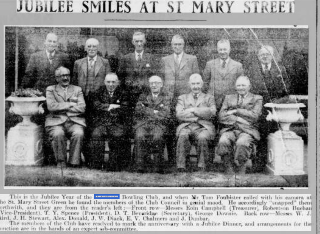 Peterhead Bowlers Celebrate Members of the Peterhead Bowling Club celebrated the fiftieth anniversary of their club at dinner and presentation of prizes in the Palace Hotel. Peterhead, last night. Ten feet were added to the playing surface of the green two years ago cost of £4OO. The toast ‘The Scottish Bowling Association” was given by Mr T. J. Smith. W. A Gauld, a past president of the association, replied. Mr James M’Lean gave the toast ‘The Buchan Bowling Association.” and the association president. Mr H. Milne. Ellon, replied.